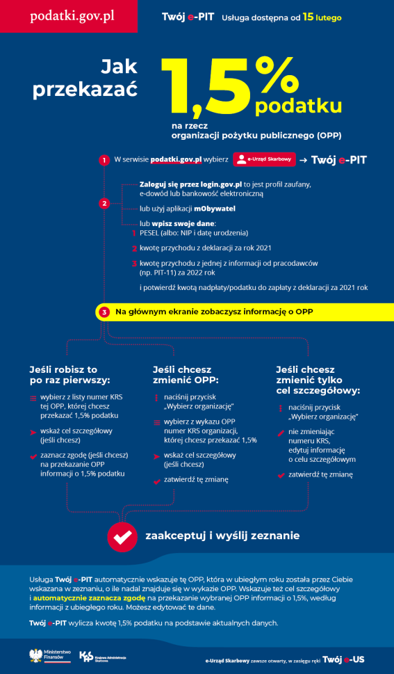 Jeżeli złożysz oświadczenie PIT-OP, będzie to oznaczać, że wyraziłeś zgodę na przekazanie kwoty w wysokości 1,5% podatku należnego.