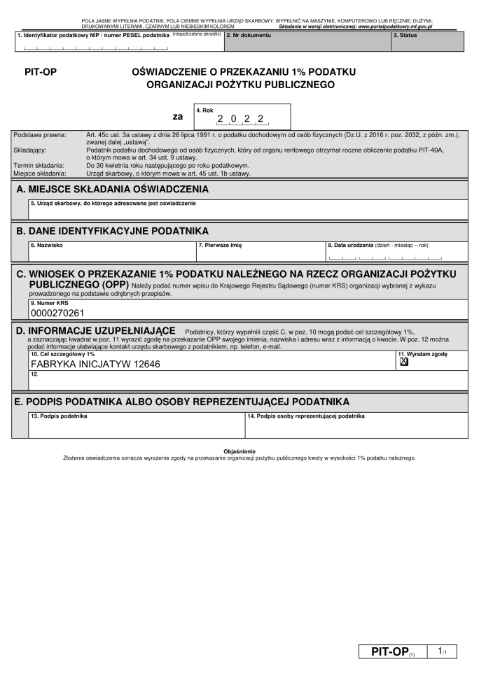 • chcesz przekazać 1,5% podatku wybranej organizacji pożytku publicznego wystarczy, że złożysz PIT-OP w terminie do 30 kwietnia roku następującego po roku podatkowym (w 2023 roku PIT-OP możesz złożyć najpóźniej do 2 maja).